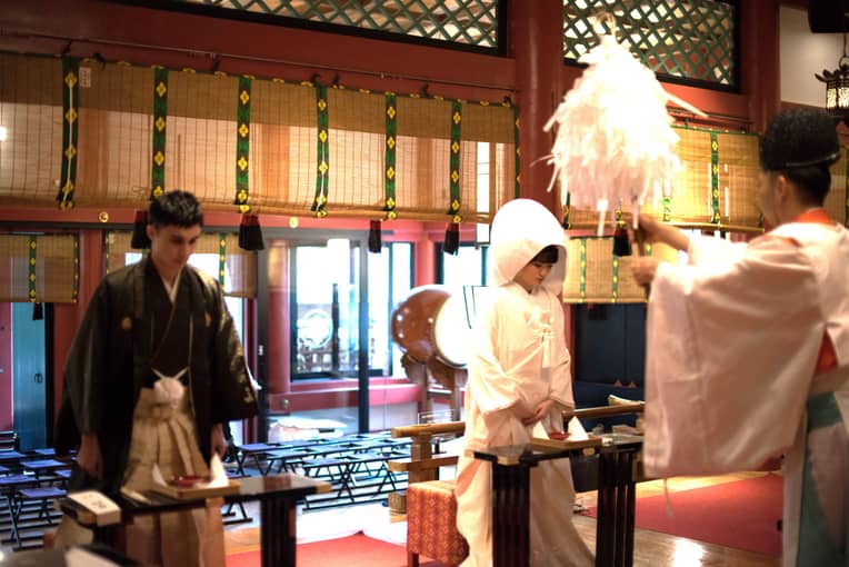来宮の杜に佇む大鳥居からの参進の儀から始まり、巫女の舞や三々九度の盃、雅楽の生演奏で奉納される伝統的な神前式は参列していただく皆様を感動に包みます。